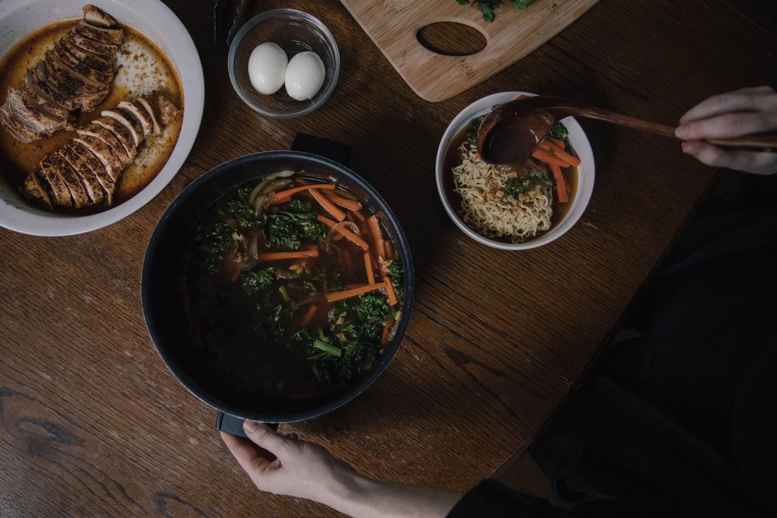 After the chicken is done and the broth is simmering nicely, soft boil the eggs. Make sure to keep the eggs in the refrigerator until you’re ready to cook them. Bring a small sauce pan of water to a boil and add the eggs. Let them cook for 7 minutes. While you’re waiting for them to cook, make an ice bath by putting ice in a bowl and adding water. When the eggs are done cooking, drop the eggs in the ice bath so they’ll stop cooking. Wait a couple of minutes until they are cool enough to touch, then remove their shells. They will cool down pretty quickly so you want to make sure not to cut them in half until the very end - but don’t worry if they get cold, the broth will warm them up pretty quickly. After you’ve cooked the eggs, add the kale to the broth and stir.